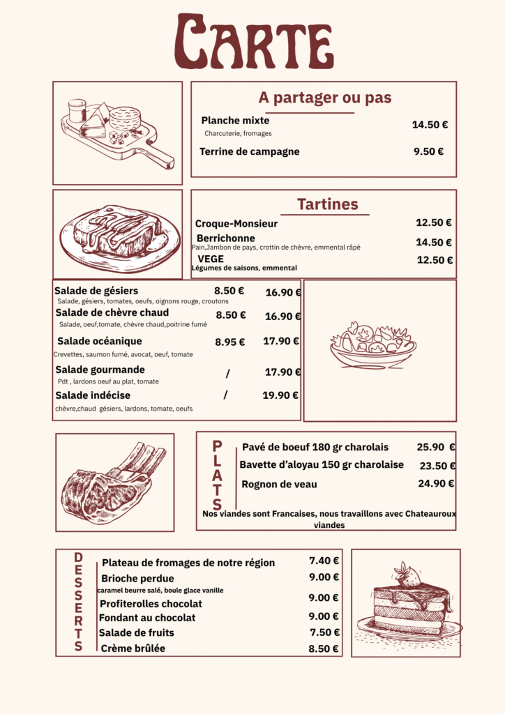 Du mardi au vendredi midi, venez découvrir notre menu du jour, préparé avec des produits frais et locaux. Une cuisine simple, et généreuse, comme à la maison, idéale pour une pause déjeuner gourmande dans une ambiance chaleureuse.